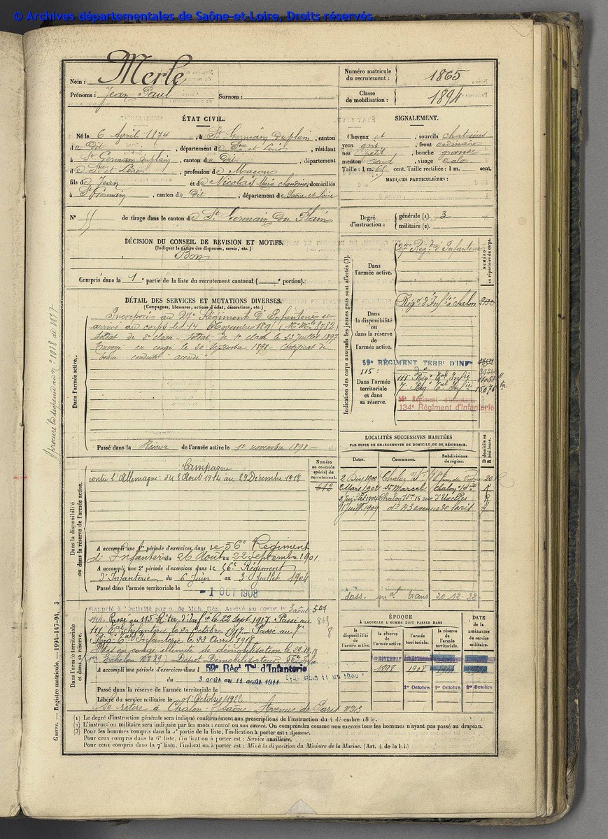 Source : Fiche matricule des archives départementales de Saône et Loire-71-Cote 1 R RM Chalon 1894/4