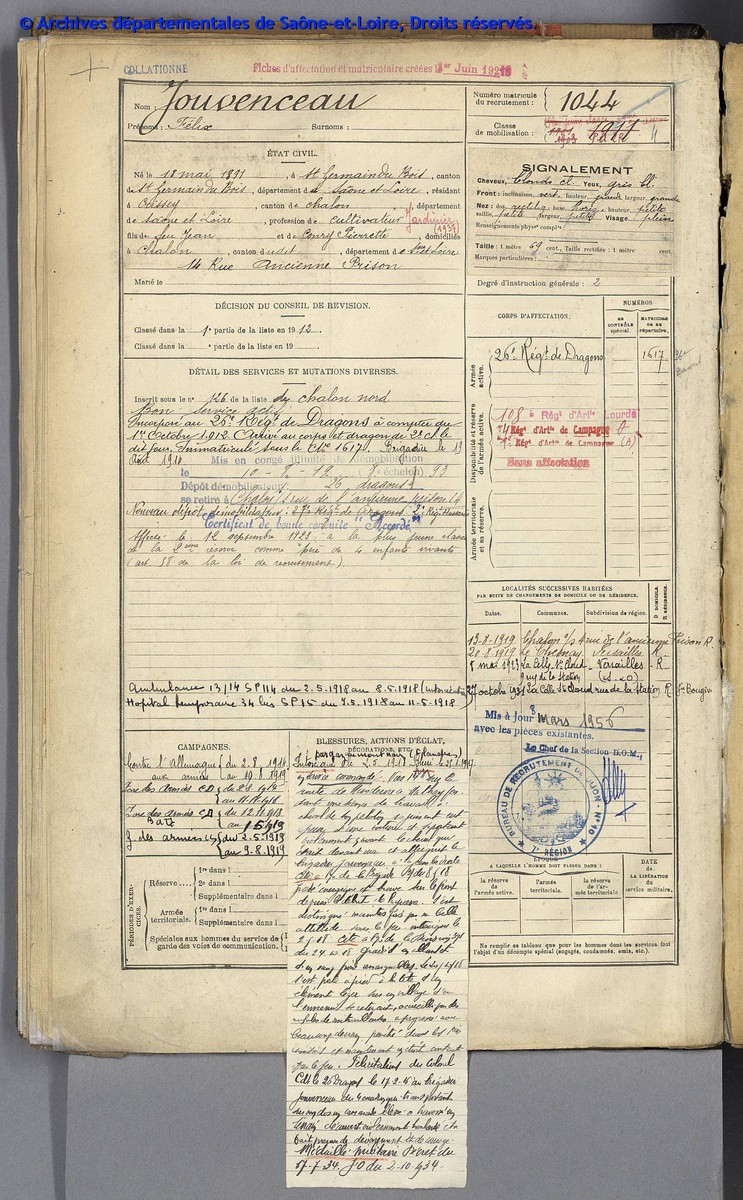 Source : Fiche matricule des archives départementales de Saône et Loire-71-Cote R RM Chalon 1911/3