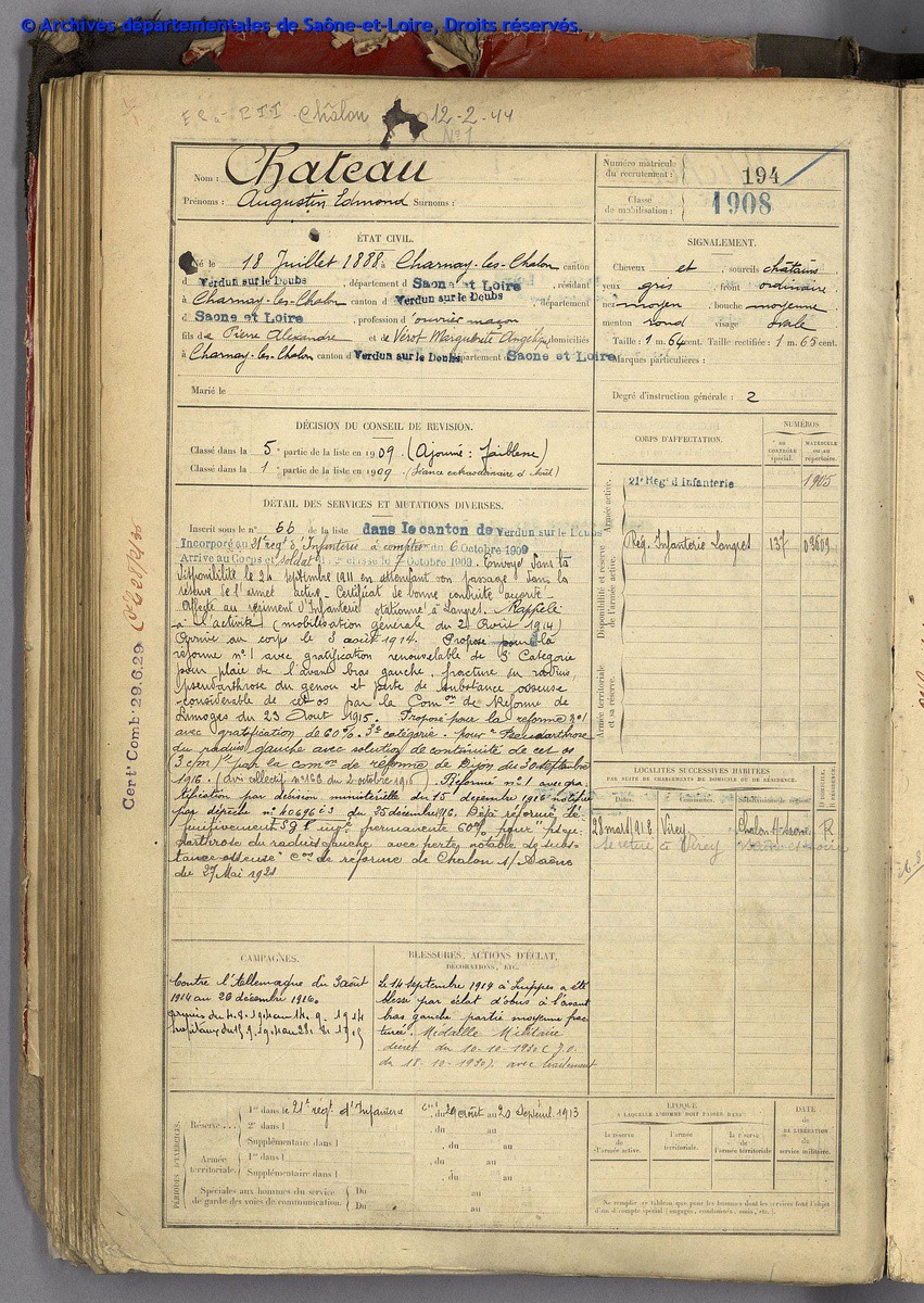 Source : Familiale et Fiche matricule (Archives départementales de Saône et Loire-71-Cote 1 R RM Auxonne-Mâcon 1908/1)