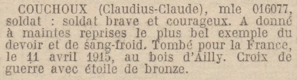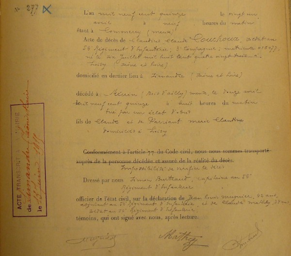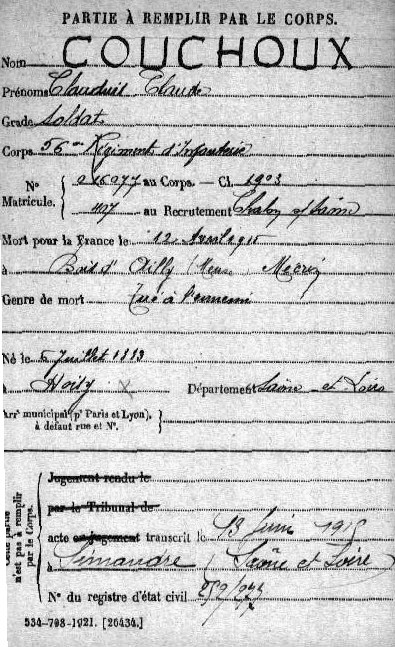 Date de naissance peu lisible 1889 ? Classe 1903 ? Lieu de naissance peu lisible : Loisy ? Date de décès le 11/04/1915 sur le RP