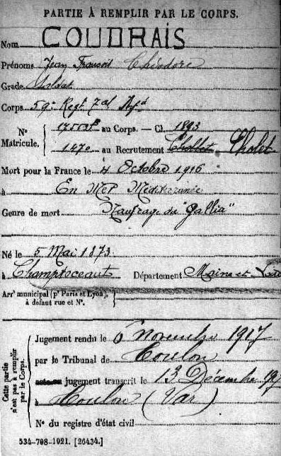 Disparu en mer lors du torpillage duGallia. Enfants : Marie,15 ans : Jean, 13 ans Lucienne, 10 ans.