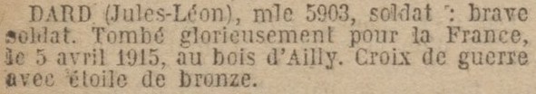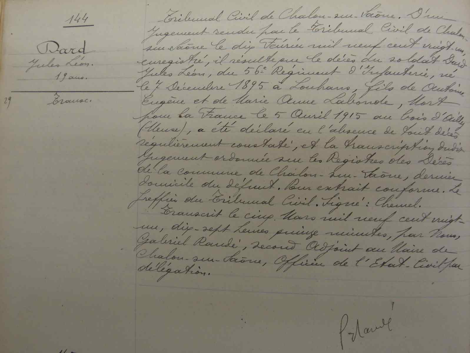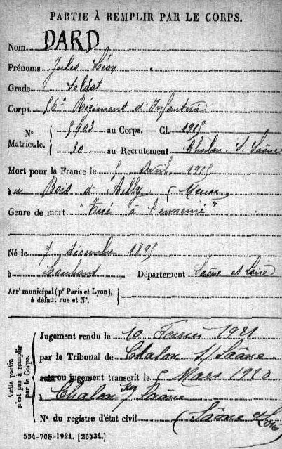 Erreur entre les dates de jugement et acte ( MDH) L`acte ne peut être que de 1921 au lieu de 1920 comme porté sur MDH, puisque le jugement est de 1921 Elève Ecole Professionnelle 1907 à 1911 I Engagé le 26 août 1914