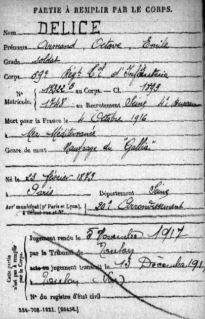 Lieu précis de décès : Naufrage du GALLIA