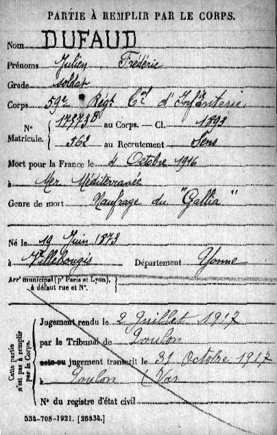 Lieu précis de décès : Naufrage du Gallia