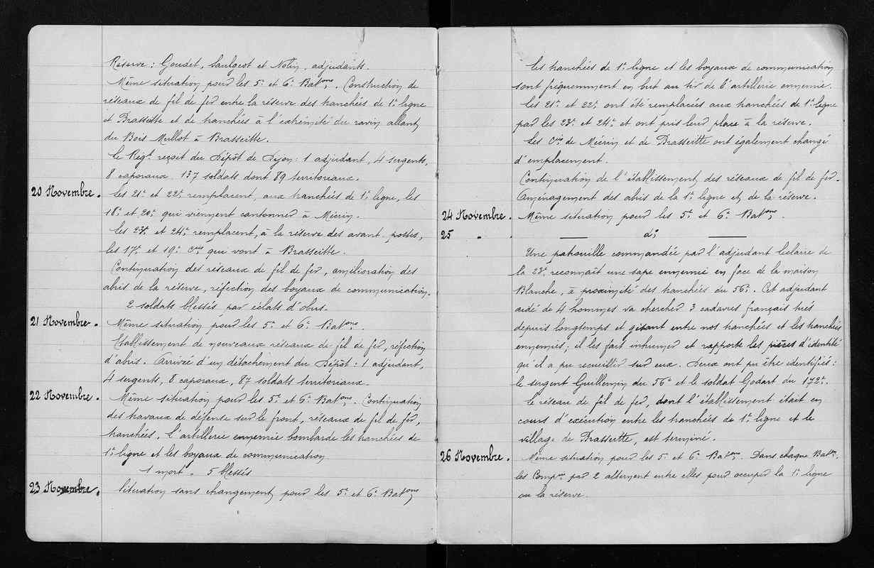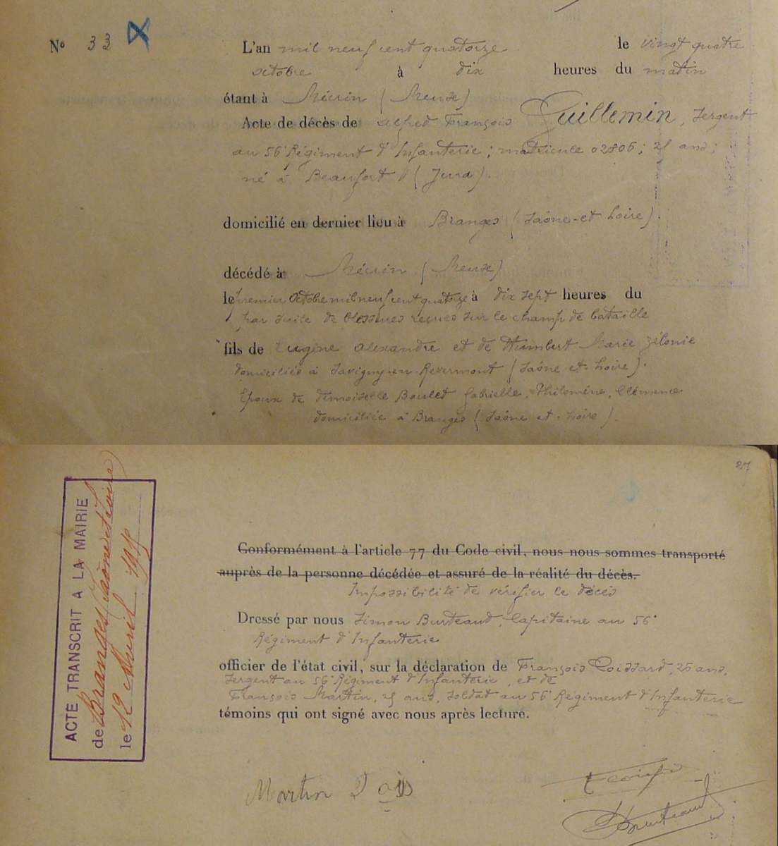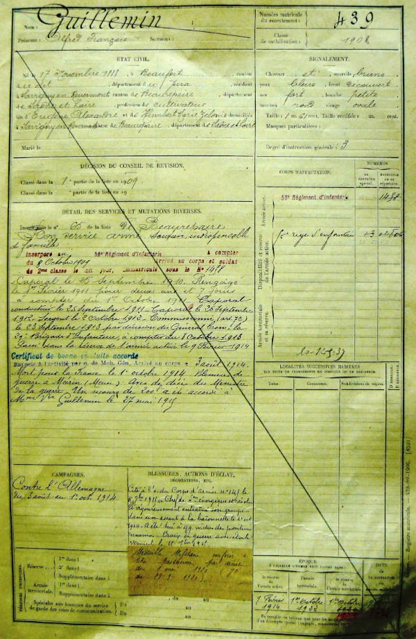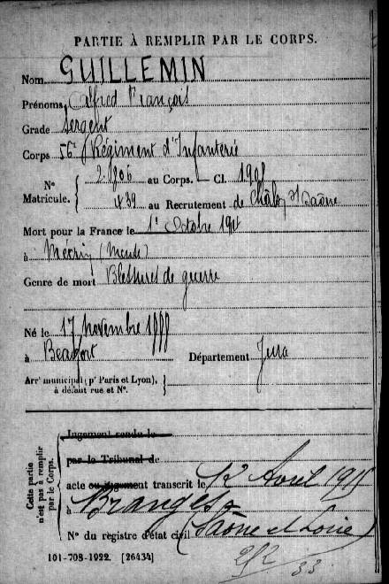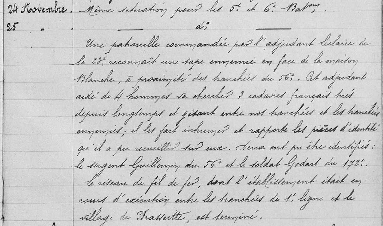 Le corps du sergent Alfred-François GUILLEMIN a été découvert fortuitement par une patrouille, conduite par l'Adjt, Leclaire, du 227ème RI le 25-11-1914 en face de la Maison Blanche. Il a été formellement identifié par ses papiers et inhumé sur place,