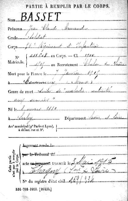 Un secours de 150 Francs a été accordé le 09/06/1915 à Mme Vve BASSET