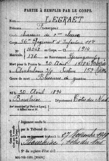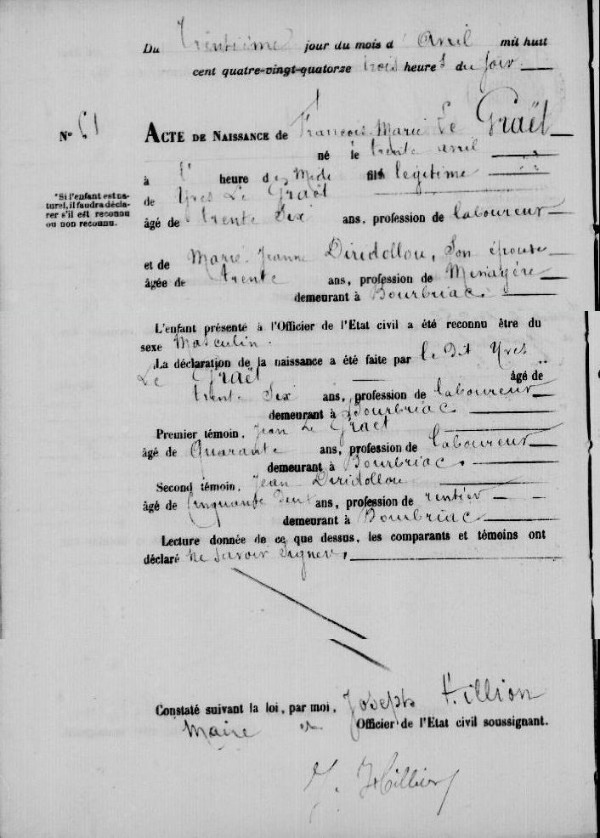 Celibataire. Ascendants vivants Mr Mm Le Graet -Duïdollou