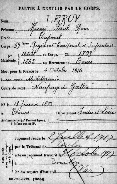Lieu précis de décès : naufrage du Gallia