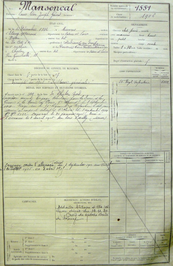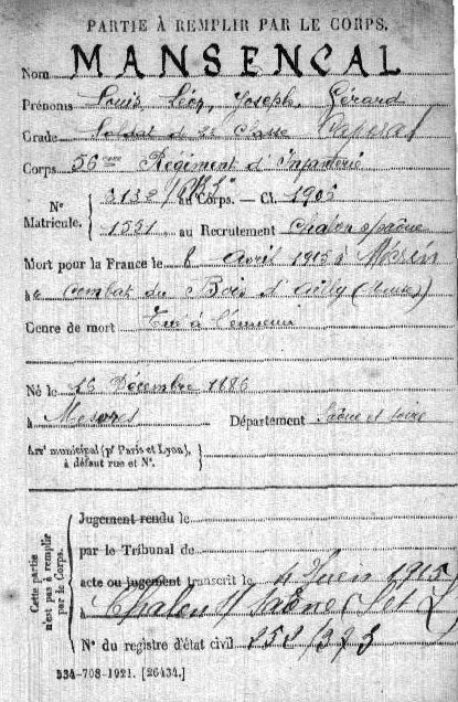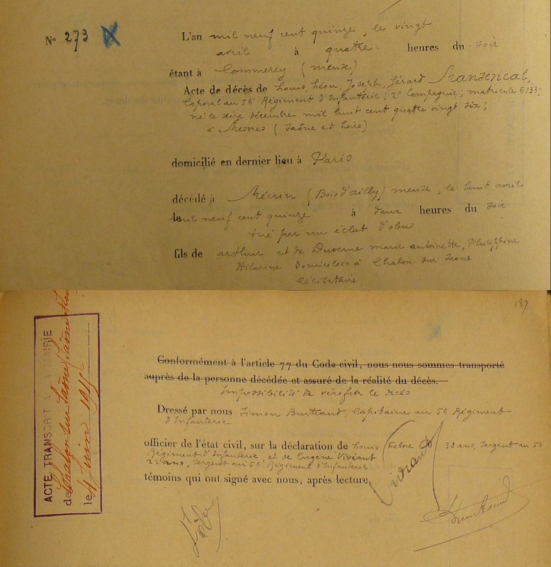 Genre de décès : tué à l`ennemi par un éclat d`obus