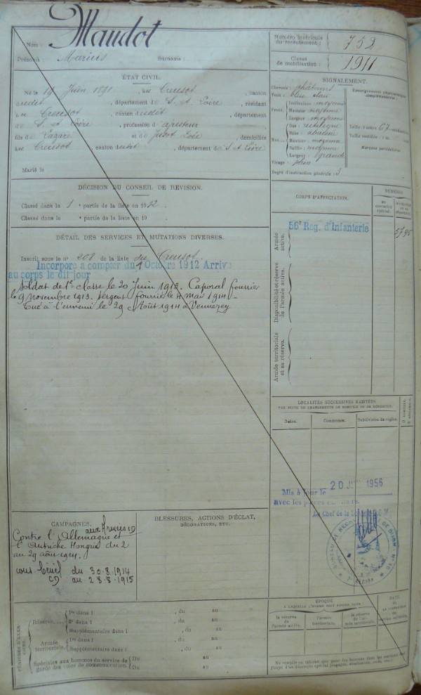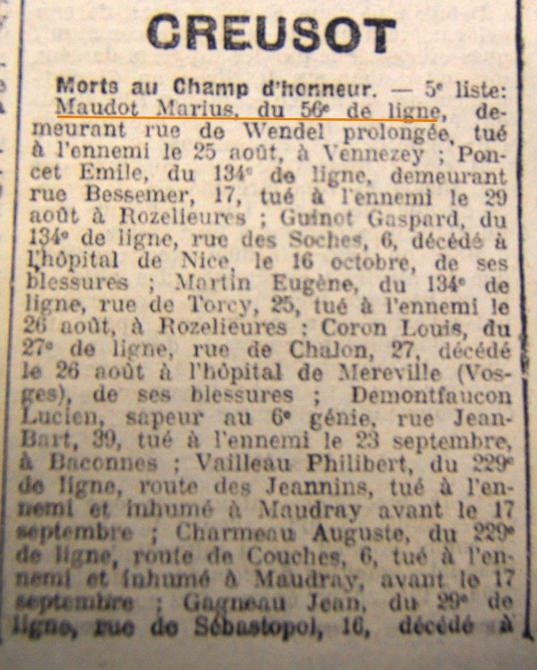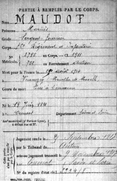 Sergent fourrier (a) Voir l`adresse sur RP - difficile à lire, --- Fils de Lazare et de GRISOT Zoée Avis de Mort au Champ d'Honneur de la ville du Creusot = Courrier de S&L non daté