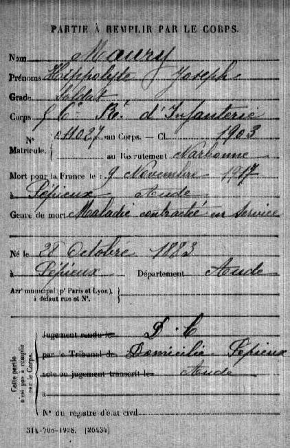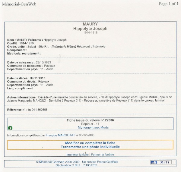 Une erreur s'est glissée dans la fiche GenWeb en ce qui concerne la mère de ce Soldat. Bien lire Marie Tuillier comme en attestent les acte de naissance et de décès.