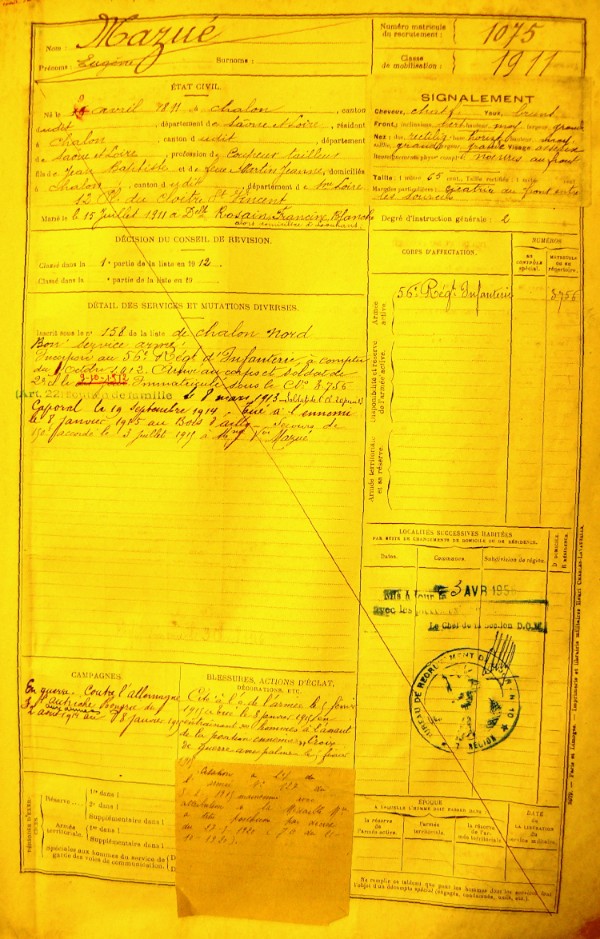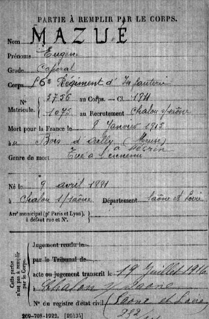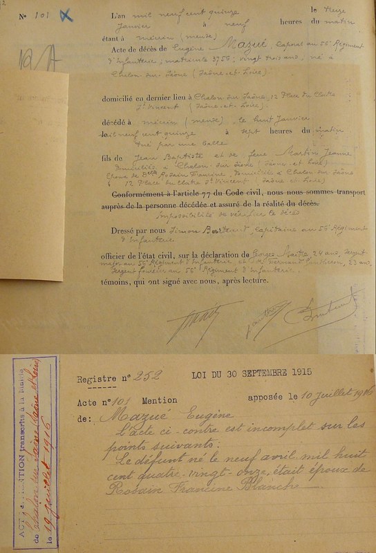 Acte de décès n° 101 du 13/01/1915 du 56e R.I., adresse épouse sur acte décès 12 Place du Cloïtre St Vincent à Chalon-sur-Saône (71)