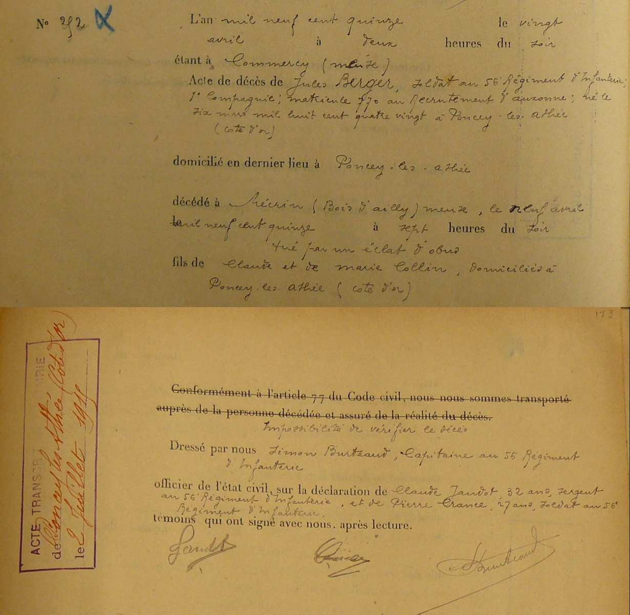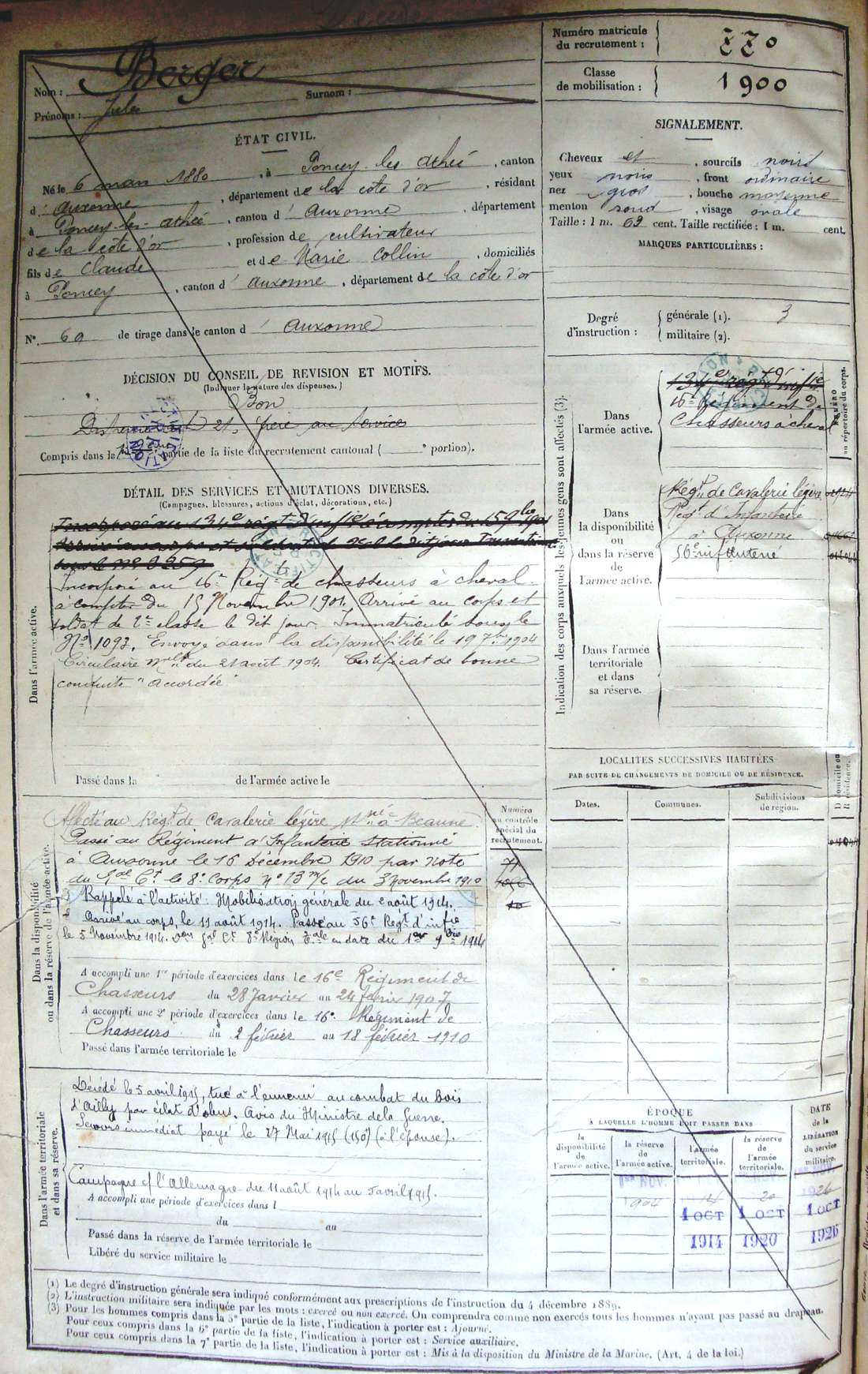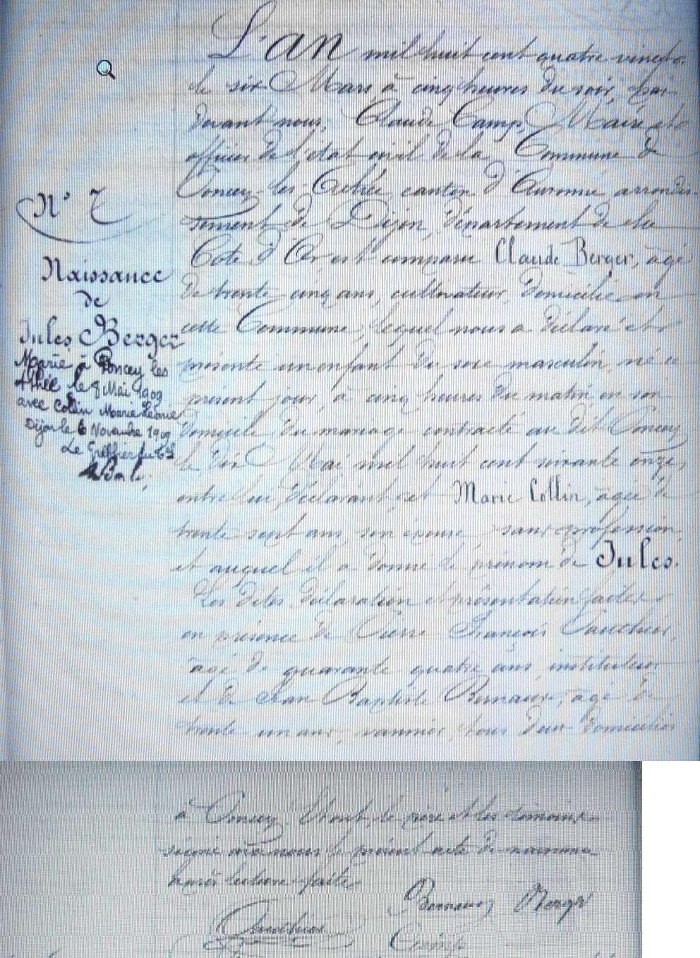 Marié à Poncey-les-Athée (21) le 8 mai 1909 avec COLLIN Marie Léonie - Enfants : Léontine,13 ans Constance, 11 ans Blandine, 6 ans.
