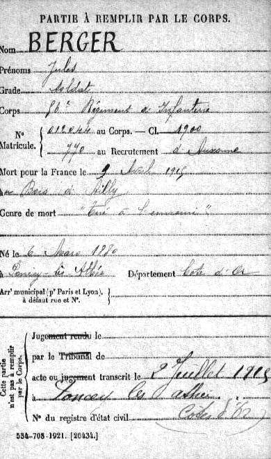 Secours immédiat payé le 27 mai 1915 (150 F) à l'épouse.