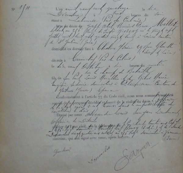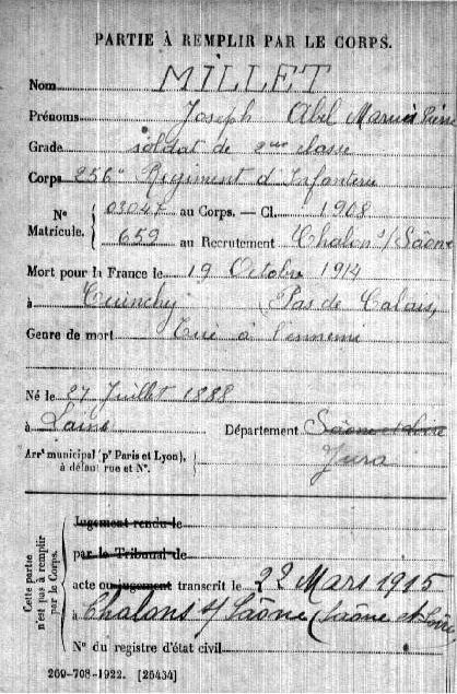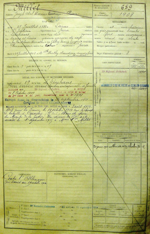 Marié le 29/07/1908 à Montret (71) - au 19/08/1919 épouse veuve non remariée vivante - 3 enfants: Roger Abel Lucien 10 ans - Georgette Marcelle 8 ans - Marie Jeanne Renée 7 ans