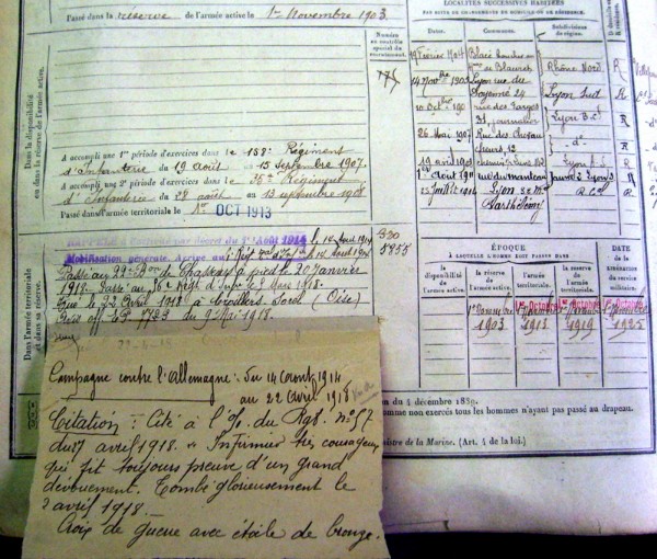 Citation à l'ordre du Régiment n° 57 du 27/04/1918 : Infirmier très courageux qui fit toujours preuve d'un grand dévouement. Tombé glorieusement le 22/04/1918 .