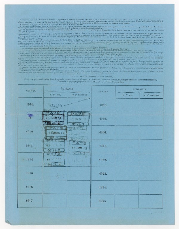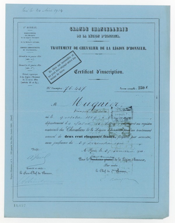 Citation à l'ordre de l'Armée le 27 avril 1916 : Est tombé glorieusement le 20 avril 1914 en entraînant sa Compagnie avec la plus grande bravoure à l'assaut d'un village.