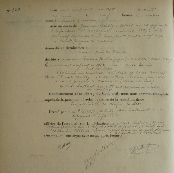 Citation à l'ordre du 56ème R.I. n° 340 du 05/09/1917 : Au front depuis le début de la campagne a toujours donné l'exemple de l'entrain et de la belle humeur dans les circonstances les plus difficiles - Tombé glorieusement le 28 mai 1917 à son poste de combat.