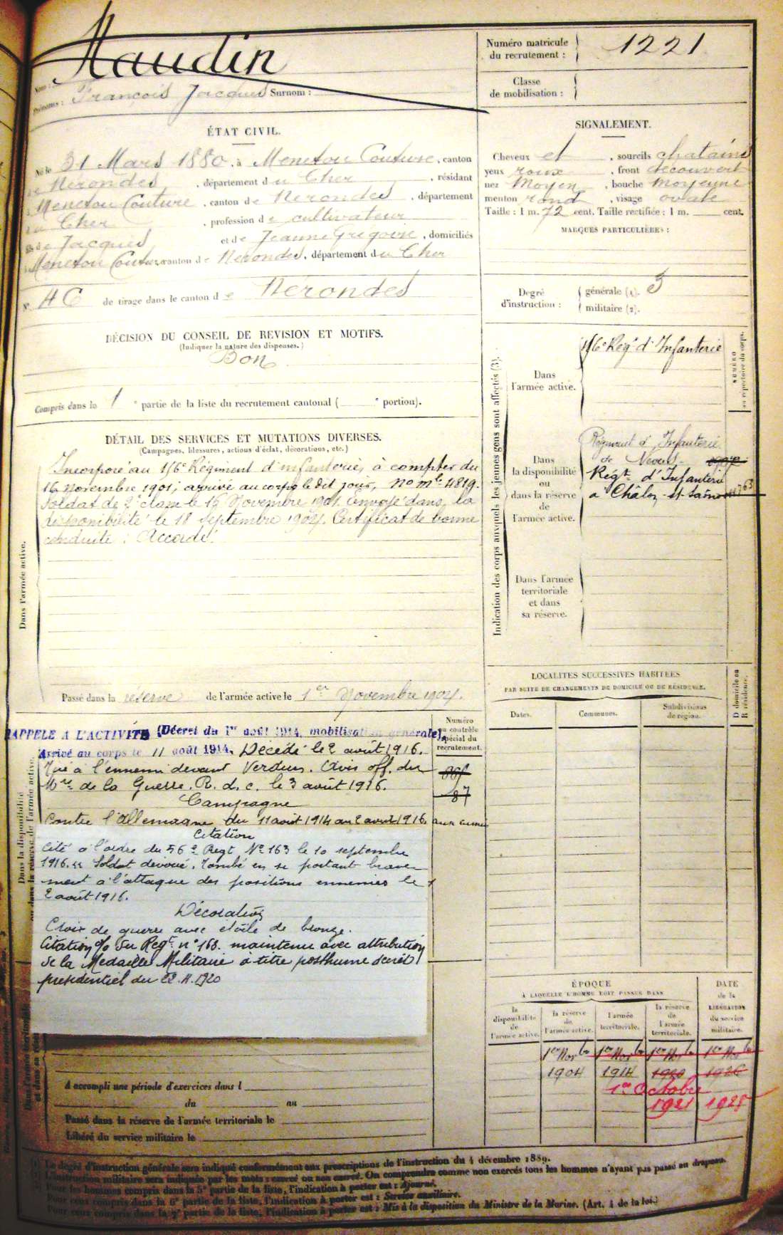 Citation à l'ordre du 56ème R.I. n° 163 du 10/09/1916 : Soldat dévoué, tombé en se portant bravement à l'attaque des positions ennemies le 02/08/1916.