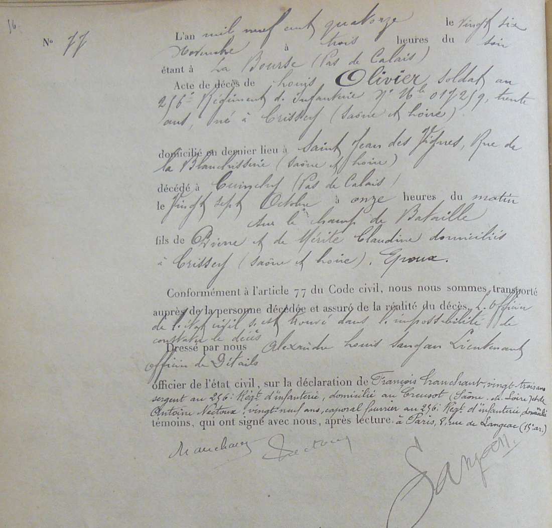 Lieu précis de décès : Combat de La Bassée