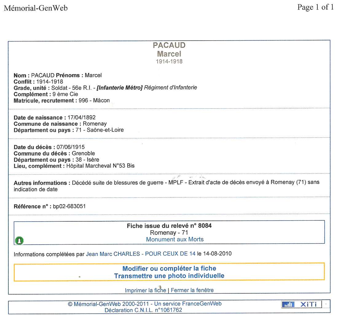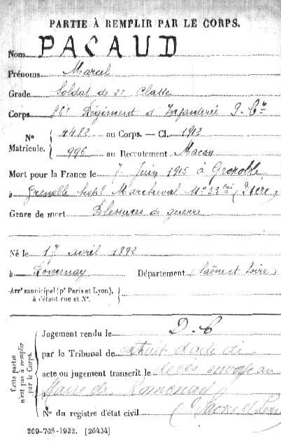 Lieu précis de décès : Hôpital Marcheval N° 53 Bis