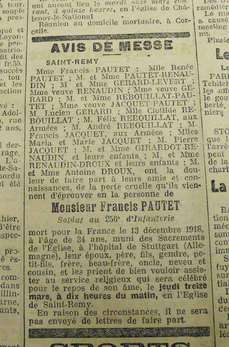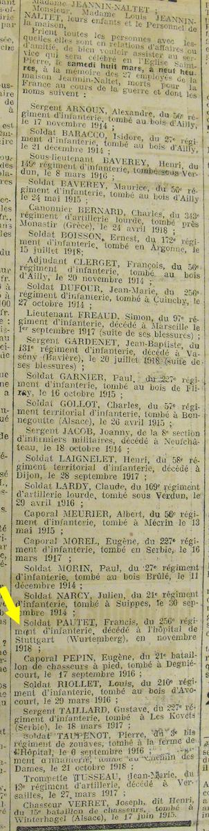 Liste récapitulatve des DC éditée par la maison Jannin-Naltet = Courrier S&L du 06-03-1919 I Avis de messe = Courrier S&L du11-03-1919
