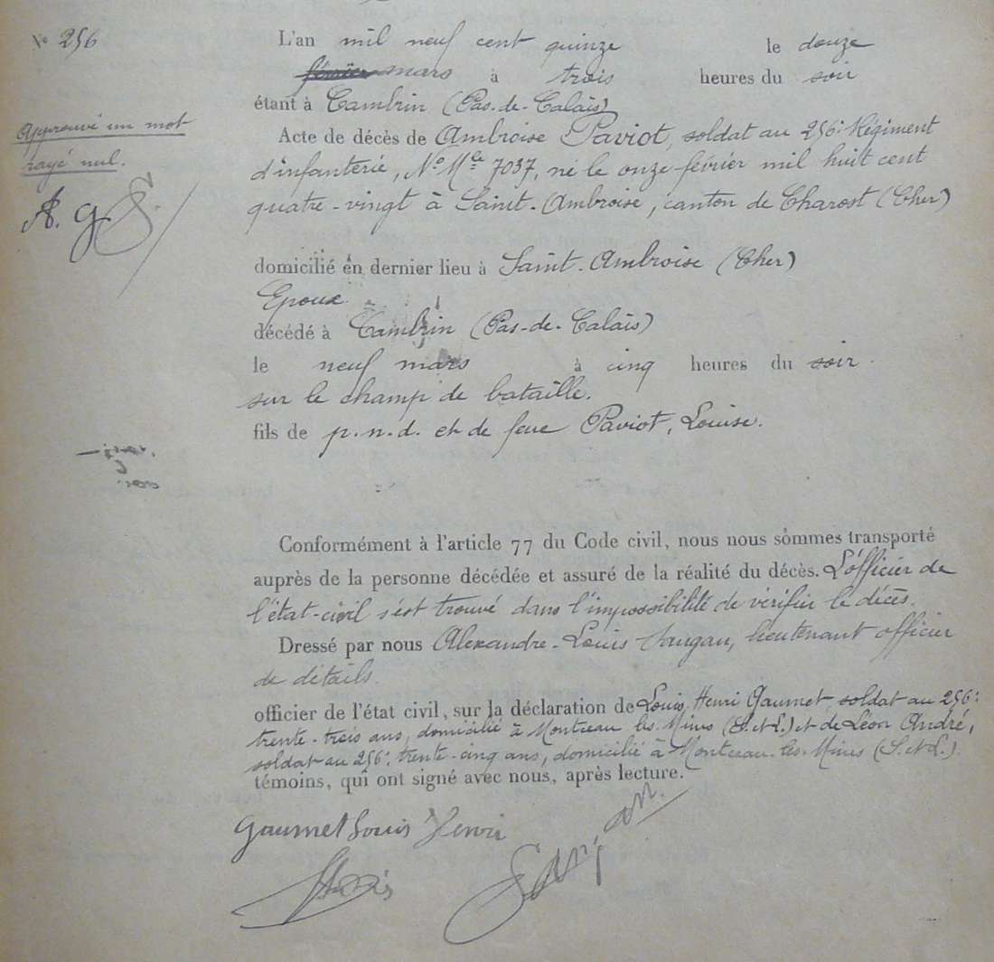 Lieu de décès : Cambrin