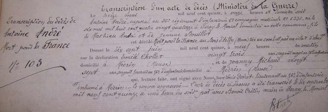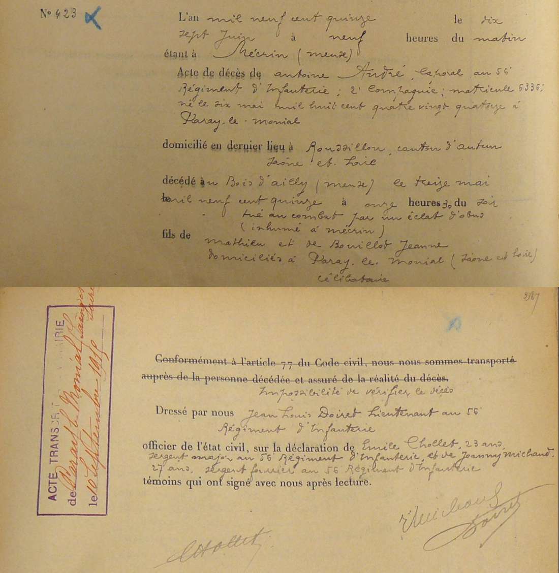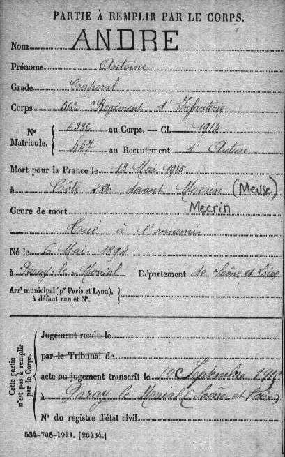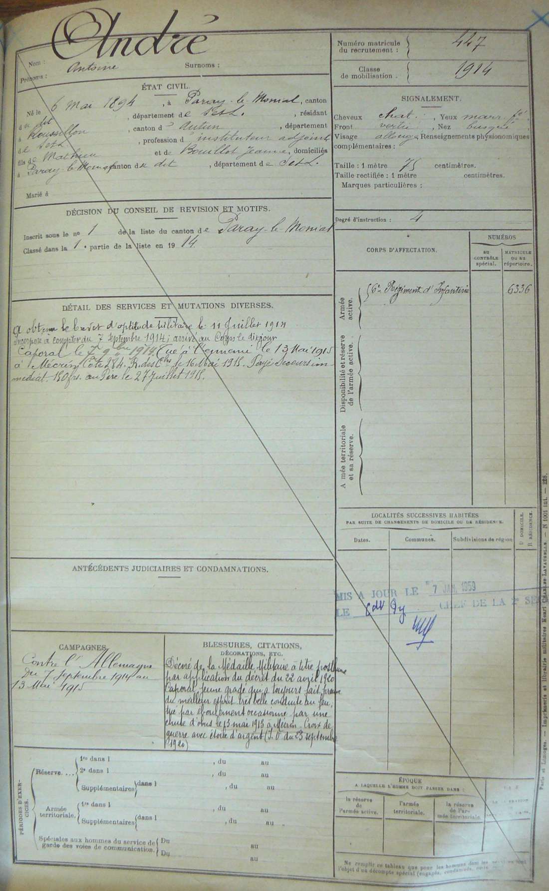 Payé secours immédiat au père le 27/07/1915. Libellé pour Médaille militaire Caporal jeune gradé qui a toujours fait preuve du meilleur esprit très belle conduite au feu tué par éboulement occasionné par une chute d'obus.