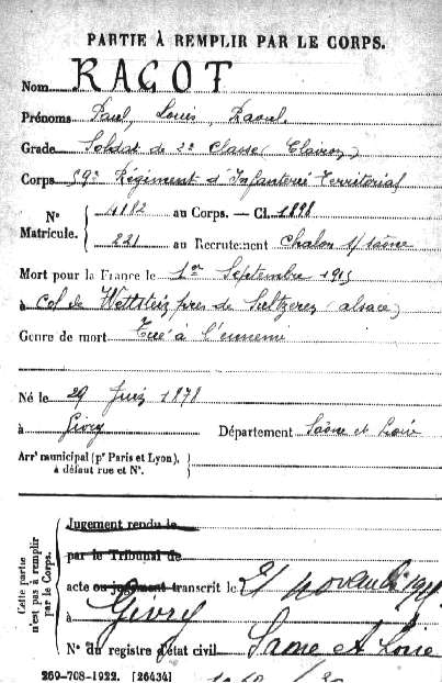 Lieu précis de décès : Combat du Linge - col de WETTSTEIN