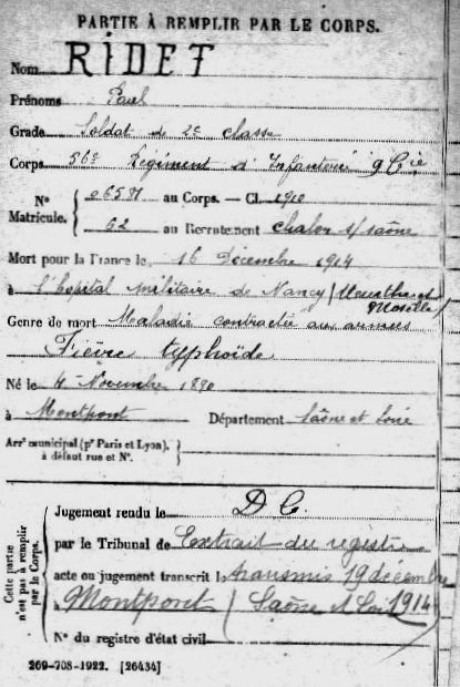 Genre de décès : Maladie contractée aux armées - Fièvre typhoïde