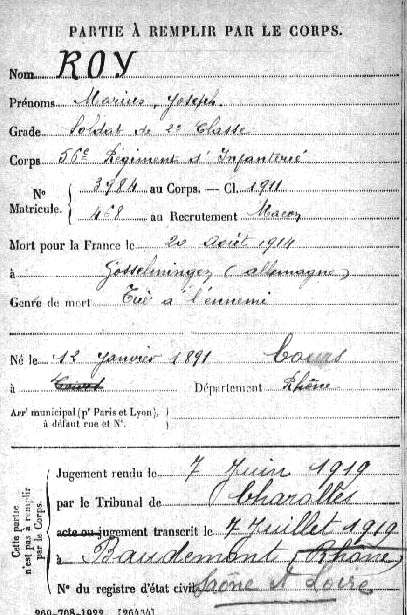 Cours (Commune fusionnée dans Cours-la-Ville le 01/03/1974) - Adresse des ayants droit : Quartier de la gare Chassigny sous Dun. Ascendants vivants Mr Mm Roy- Augoyard.