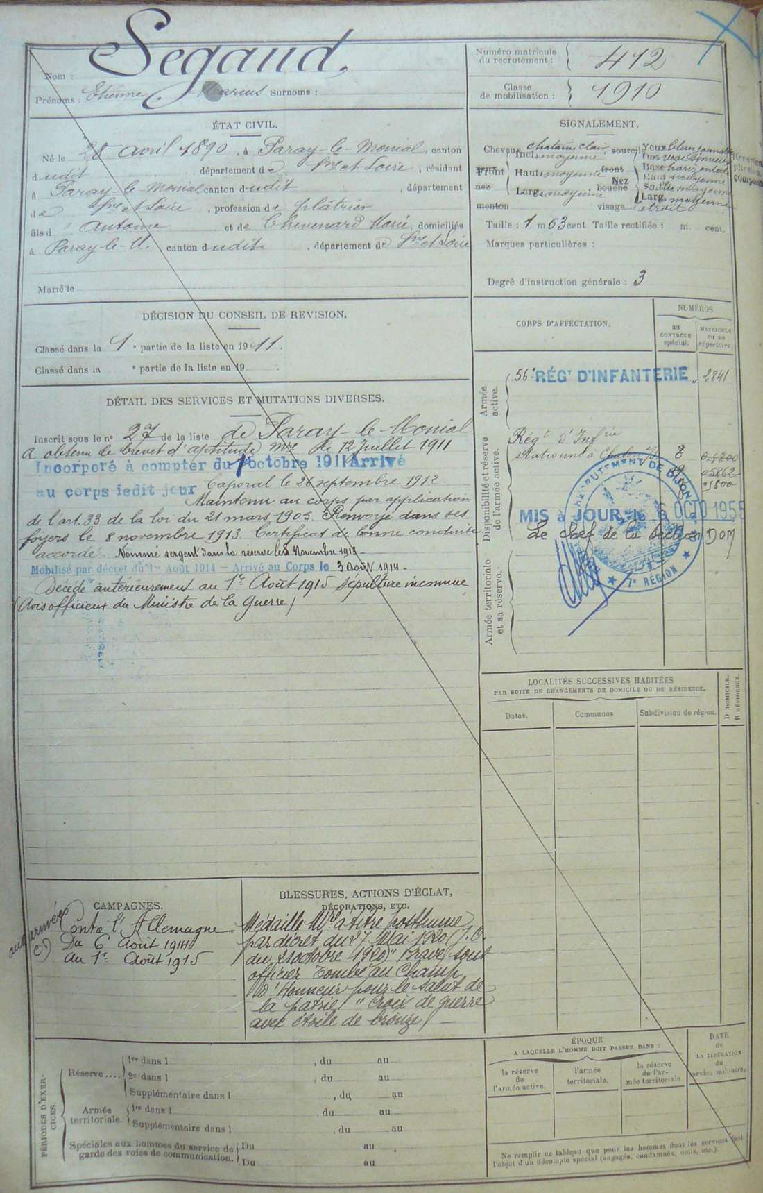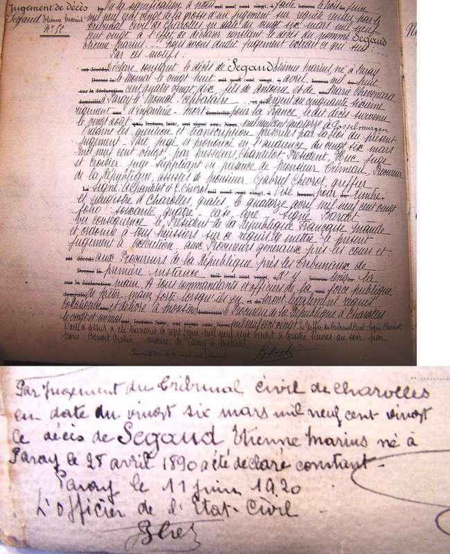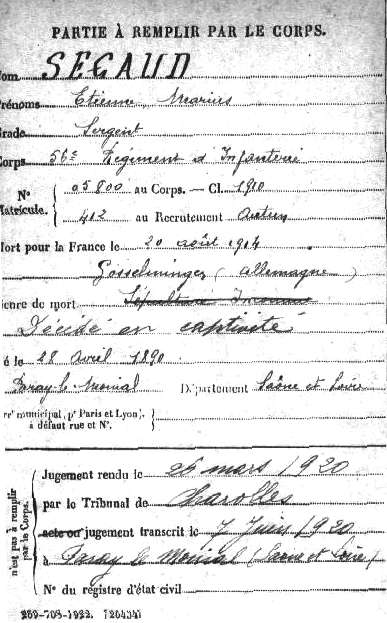 - Inscription sur le MAM et la plaque In Memoriam dans l'église : Le prénom y figurant est Claudius et non Étienne Marius. Après recherches il s'avère qu'aucun Soldat Claudius SEGAUD ne correspond. Nous pouvons donc raisonnablement penser qu'il y a eu erreur de gravure du prénom et qu'il s'agit bien d'Étienne Marius SEGAUD.