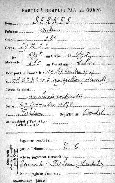 Genre de décès : Maladie contractée aux armées