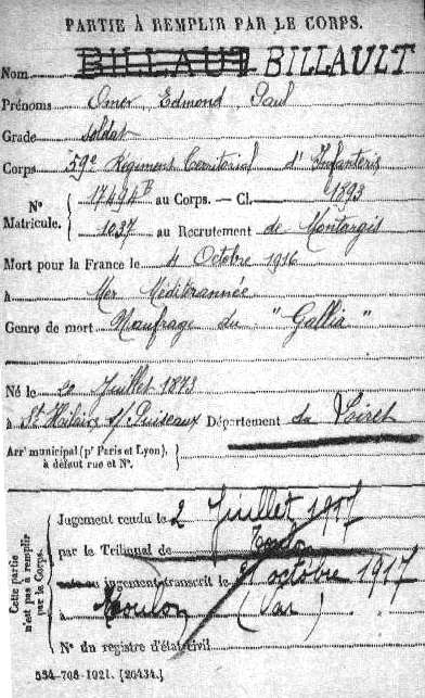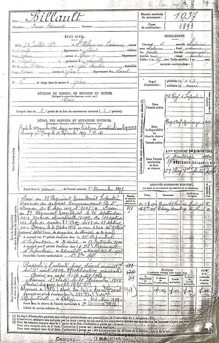 Epouse : Mme Vve BILLAULT née PINGAULT