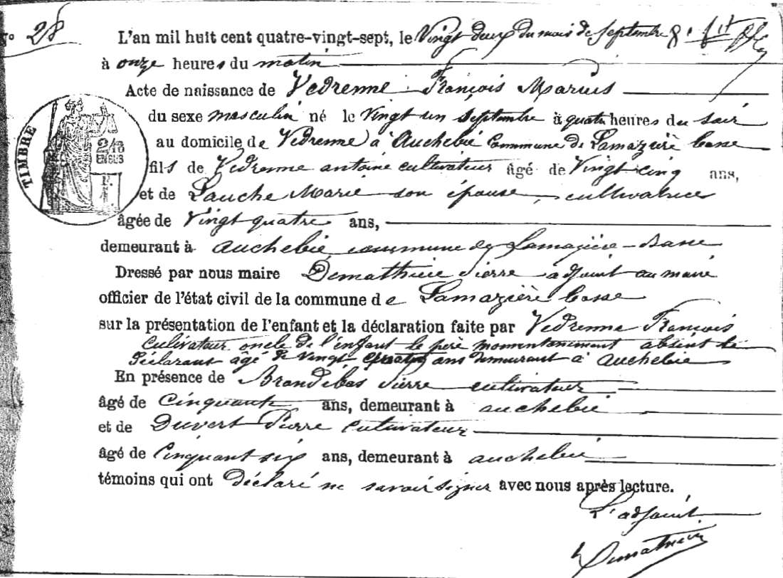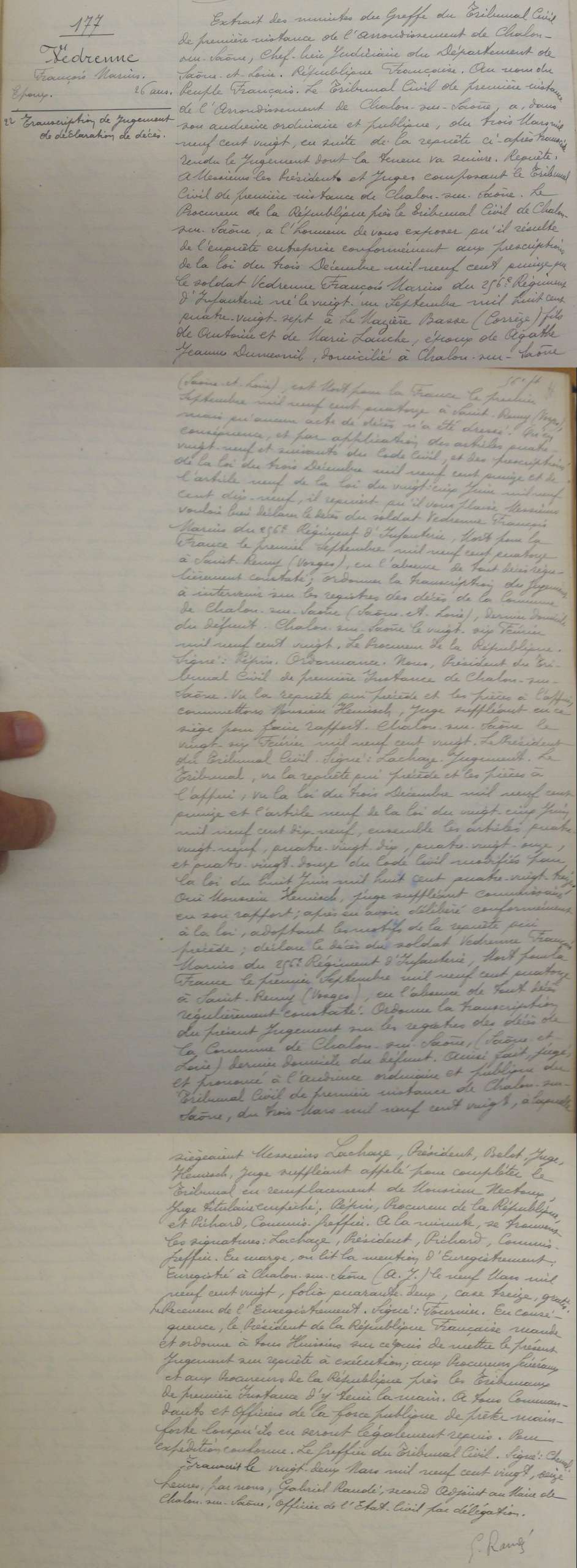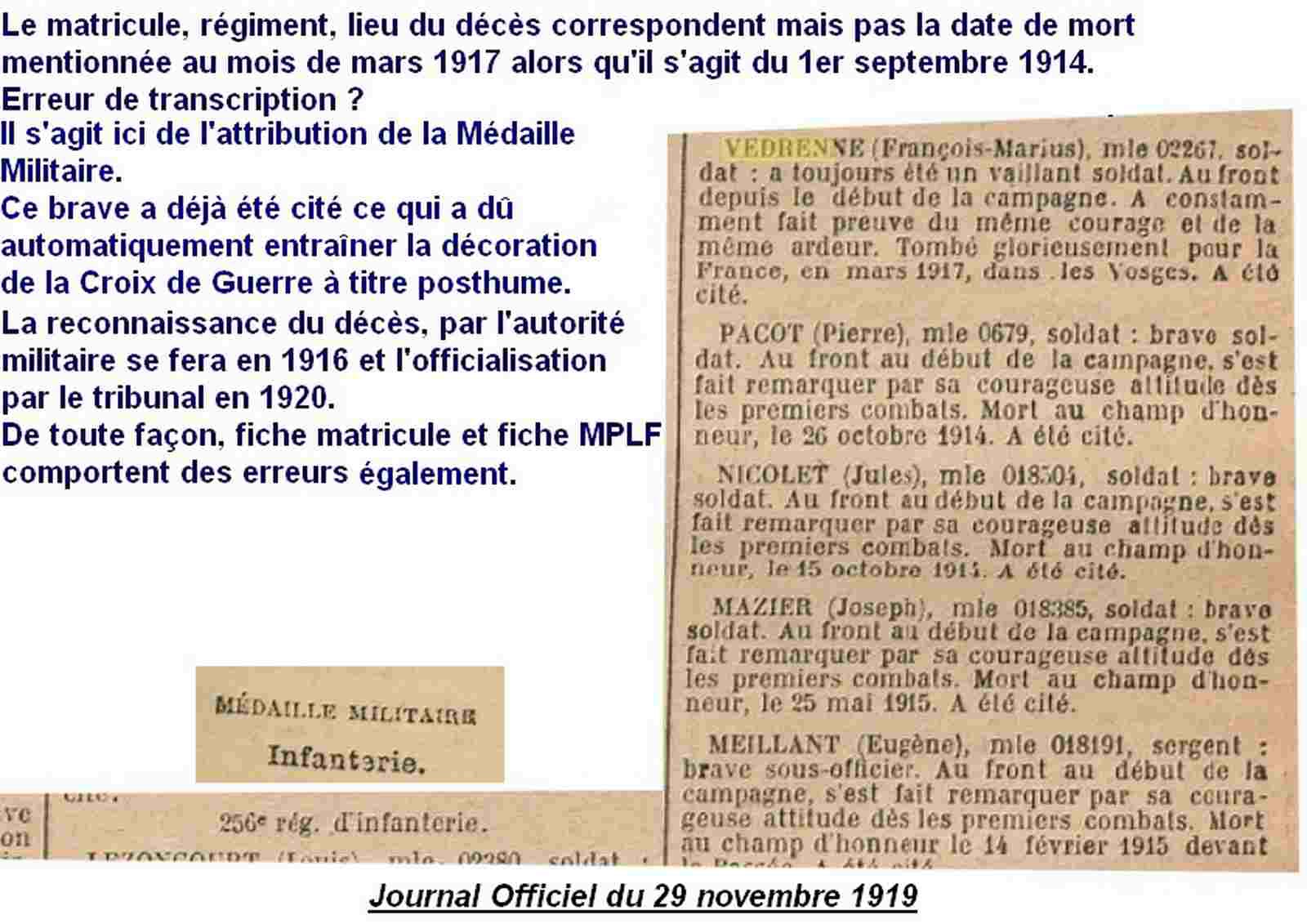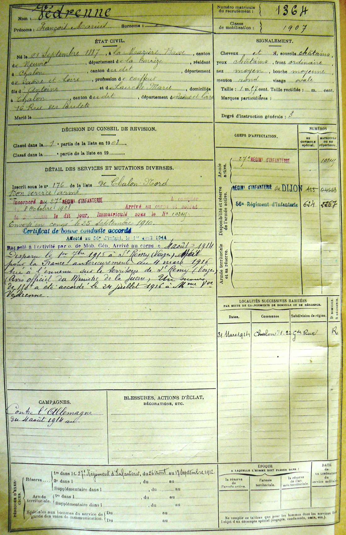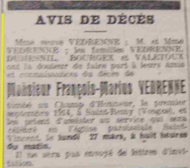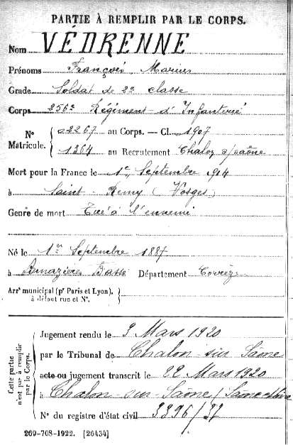 Mme. Vve Agathe-Jeanne VEDRENNE, née Dumesnil, s'est remarié le 12-01-1920 avec Claude Denis Michaud, ancien Poilu Artilleur, tout deux exerçant la profession de coiffeur à Chalon-sur-Saône (71) (Source, B.LABORIER, petit-fils).