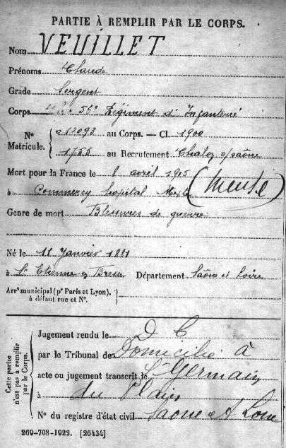 Genre de décès : Blessure au ventre aux combats du Bois d'Ailly le 07-04-1915
