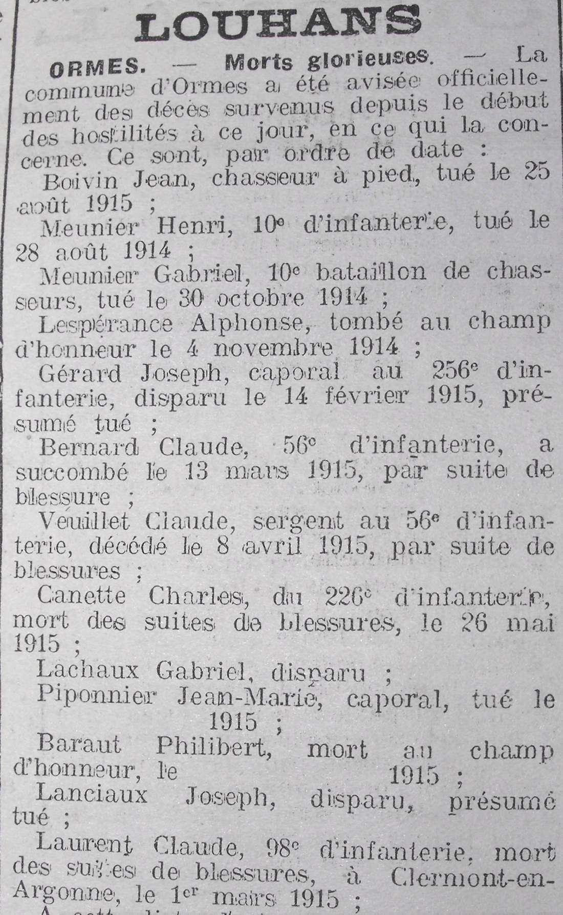 Sépulture : Inhumation sur place puis rapatriement du corps au cimetière d'Ormes (71)