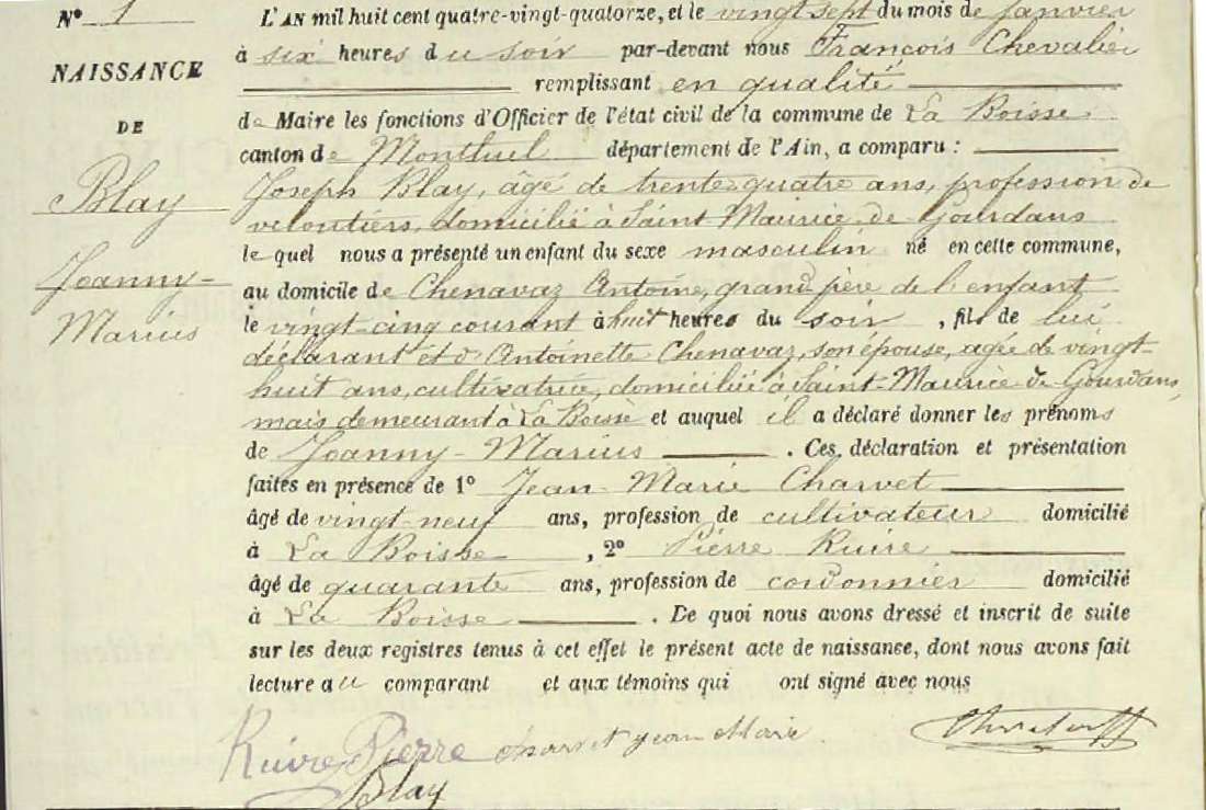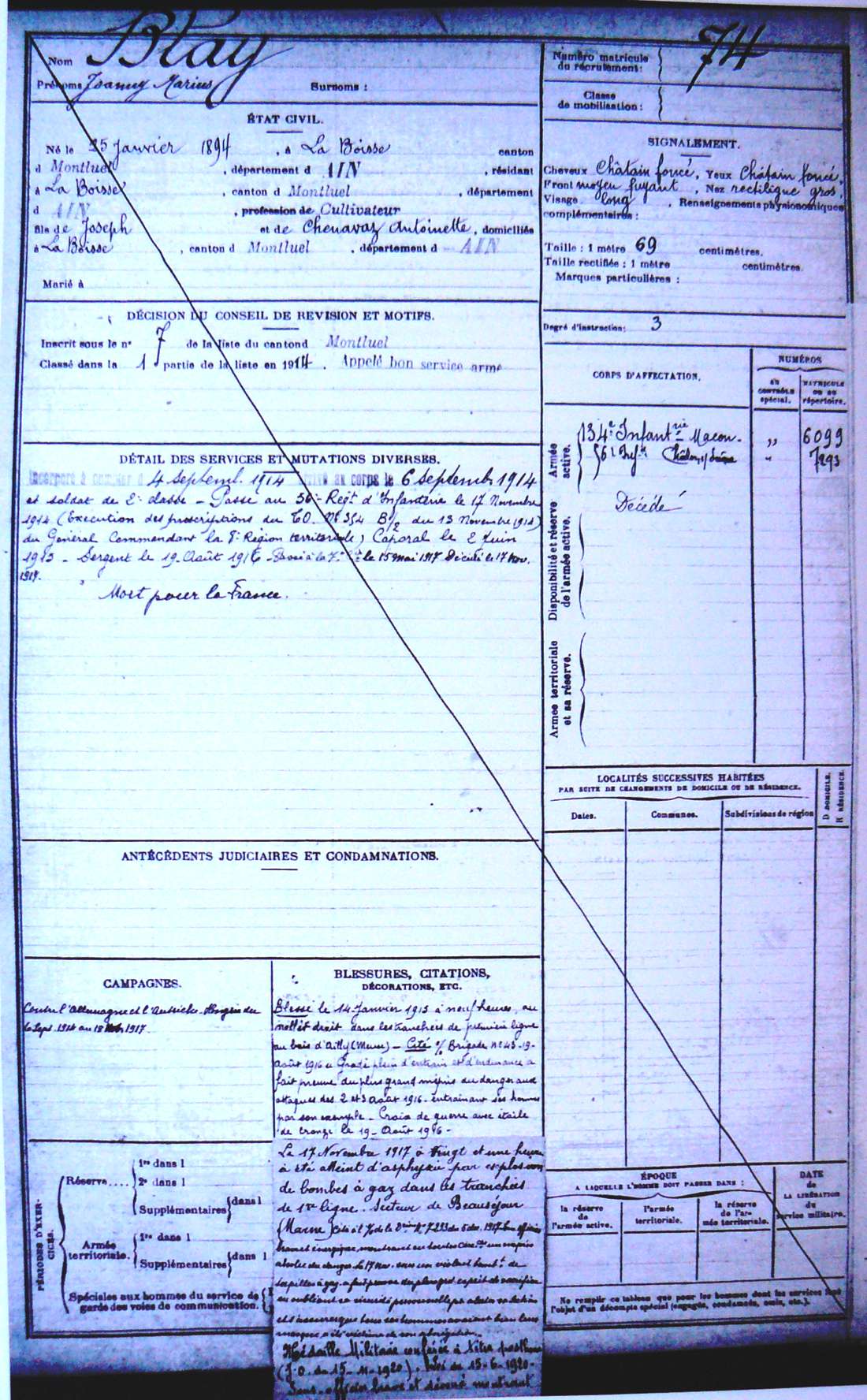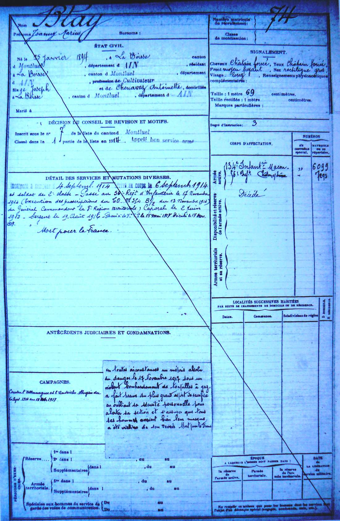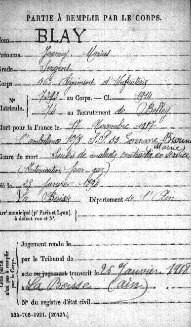 *Suite de maladie contractée en service (intoxication par gaz). Celibataire . Ascendant vivant Mm Chenavoz Divorcée de Mr Blay et Veuve.