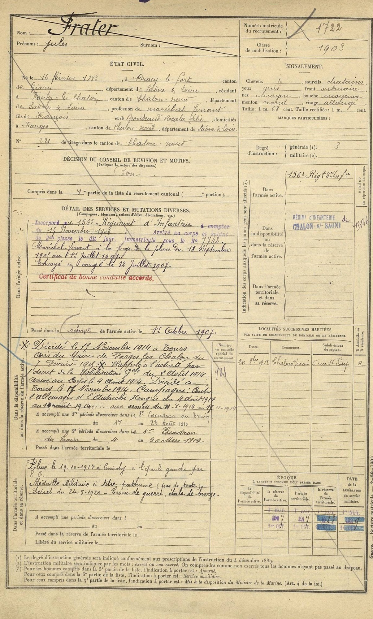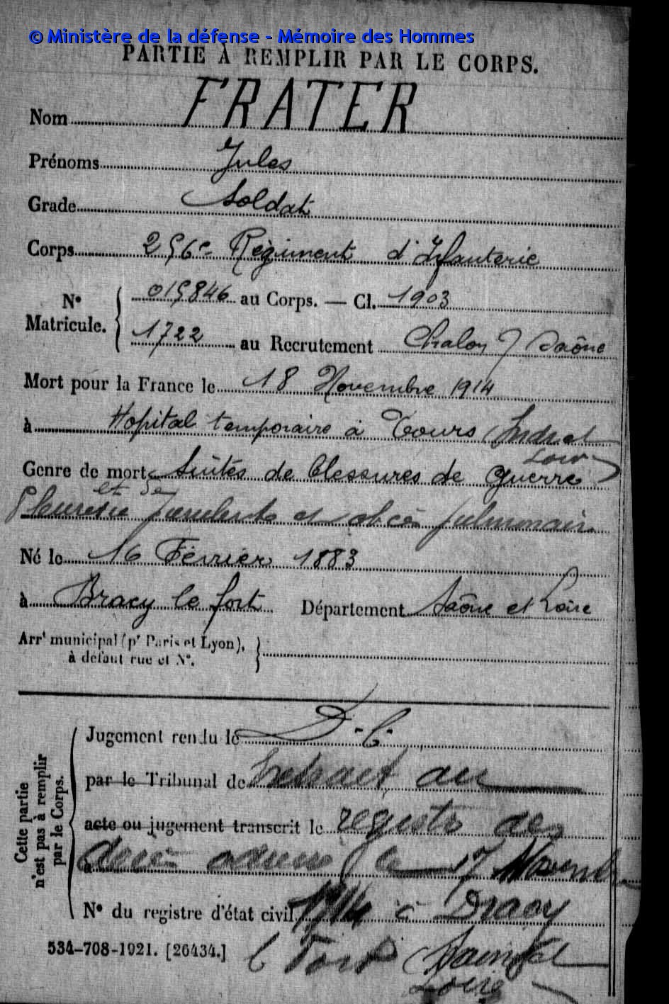 - La date de décès mentionnée sur la fiche MPLF est le 18-11-1914. Sur la fiche matricule, qui est le formulaire de référence, le décès est survenu le 15-11-1914.