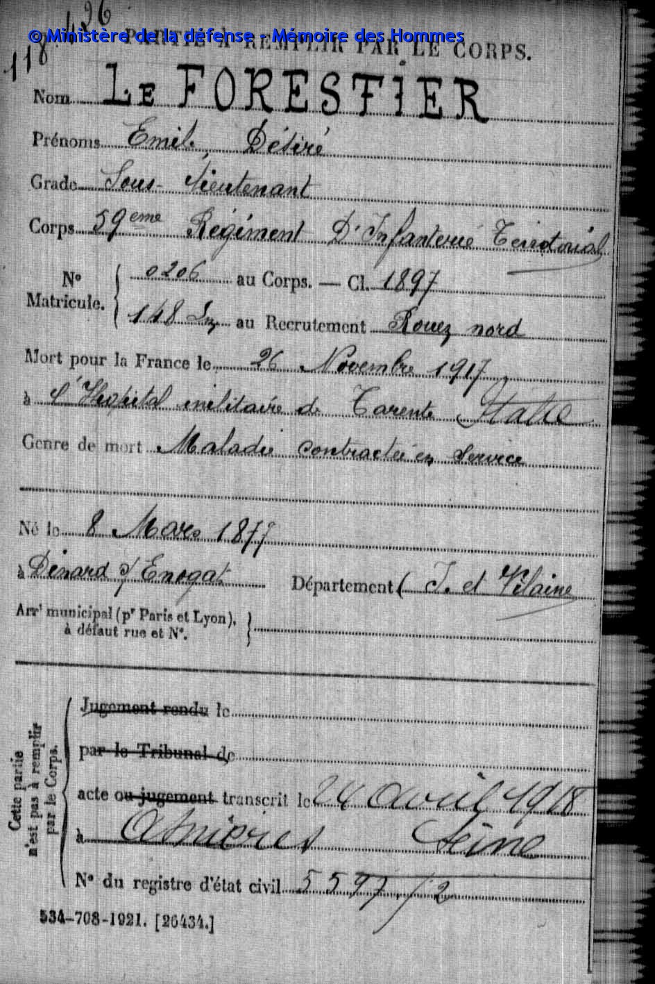 - Le patronyme est orthographié LE FORESTIER (en deux mots) sur la fiche MPLF mais aussi LEFORESTIER (en un seul mot) sur la fiche matricule (non reproduite). L'acte de naissance (non reproduit), la référence en matière d'état-civil, indique bien LE FORESTIER, en deux mots.