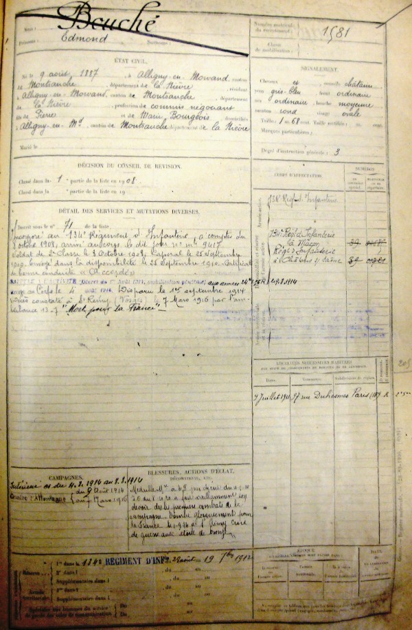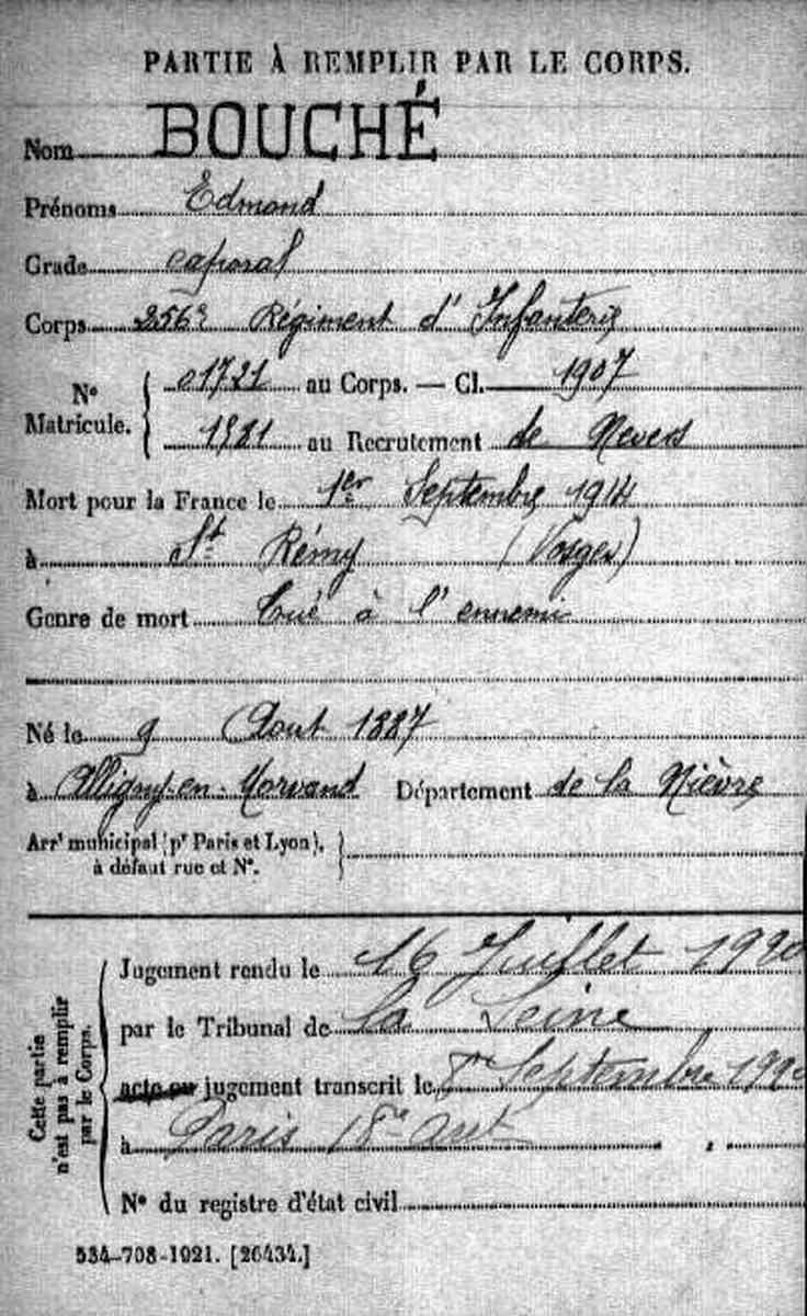 L`ayant droit, Mr Bouché Pierre est le tuteur de l`enfant âgé de 3 ans. Décès constaté le 07/03/1916 par l'Ambulance 13/7.