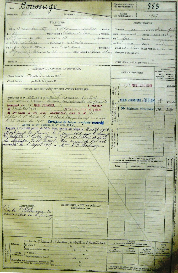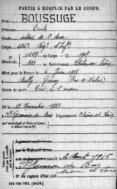 Marié à Saint-Germain-du-Bois (71) le 31/10/1912. Enfant : Adrien Épouse veuve non remariée