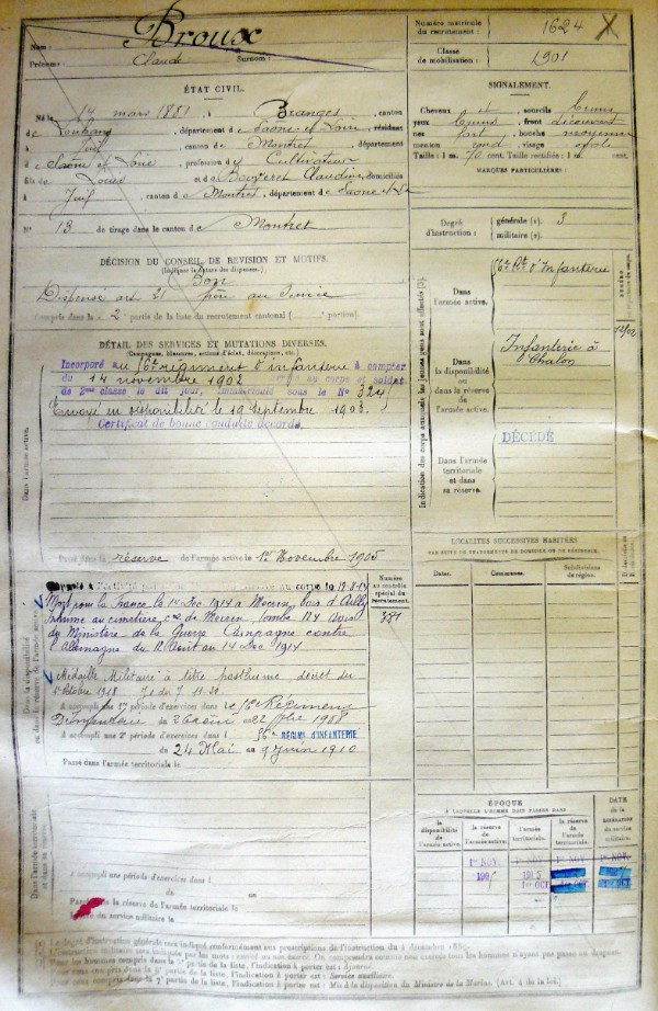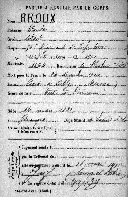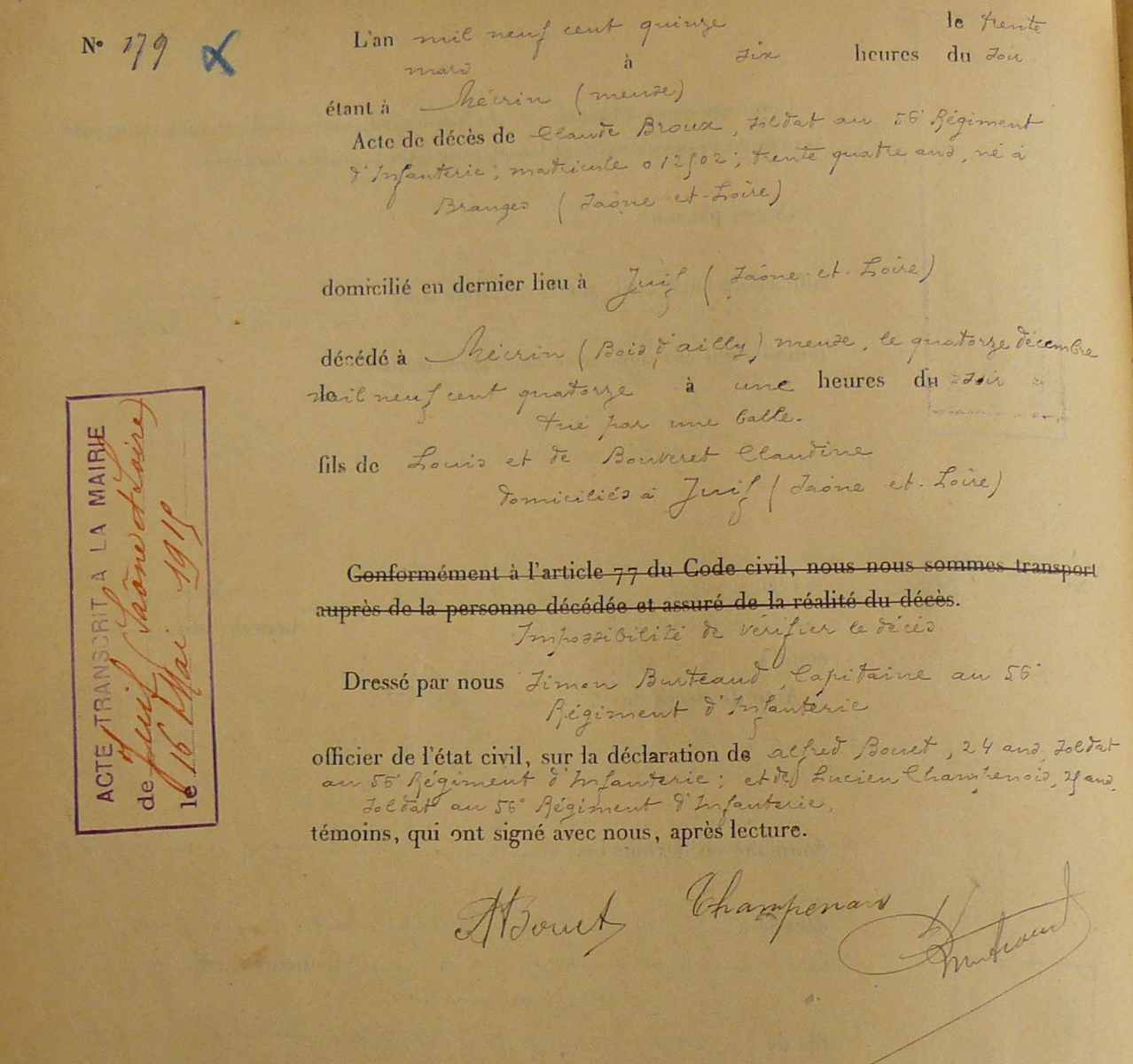 Marié à Juif (71) le 26/11/1908. Enfants : Marie 9 ans, Angèle 7 ans