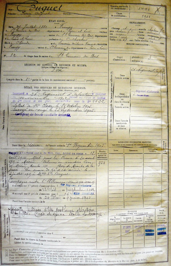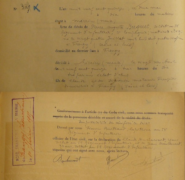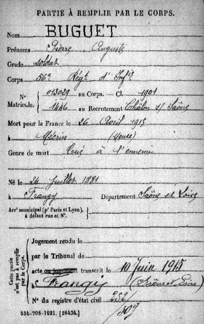 Discordance date décès MDH/RP : 26/08 ou 26/04/1915 . Fils : Henri Louis, 7 ans Léon Pierre, 4 ans