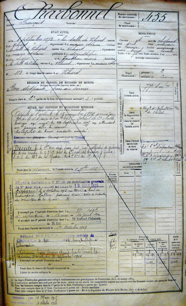 Gonnord (Commune fusionnée dans Valanjou le 01/01/1974) - L'intéressé est fils de Léger et de GAUFREAU Marie - Il s`est marié à Coron le 14/11/1909 avec CHARBONNEL Marie Jeanne
