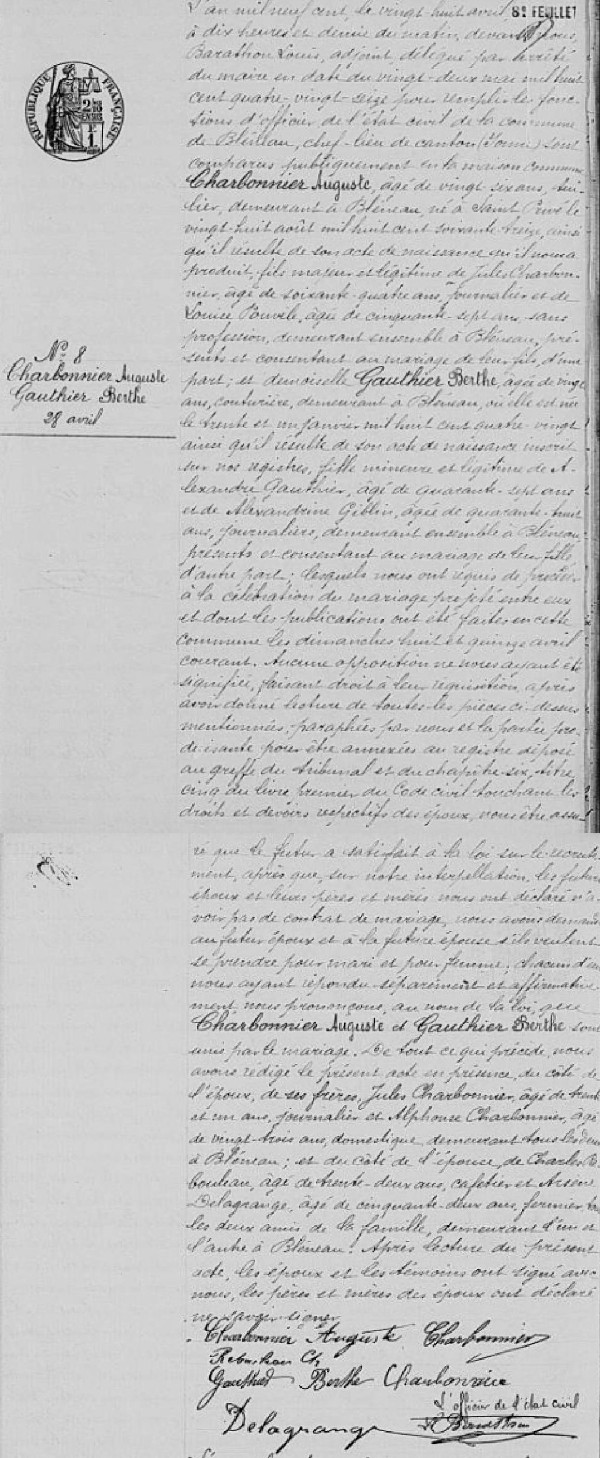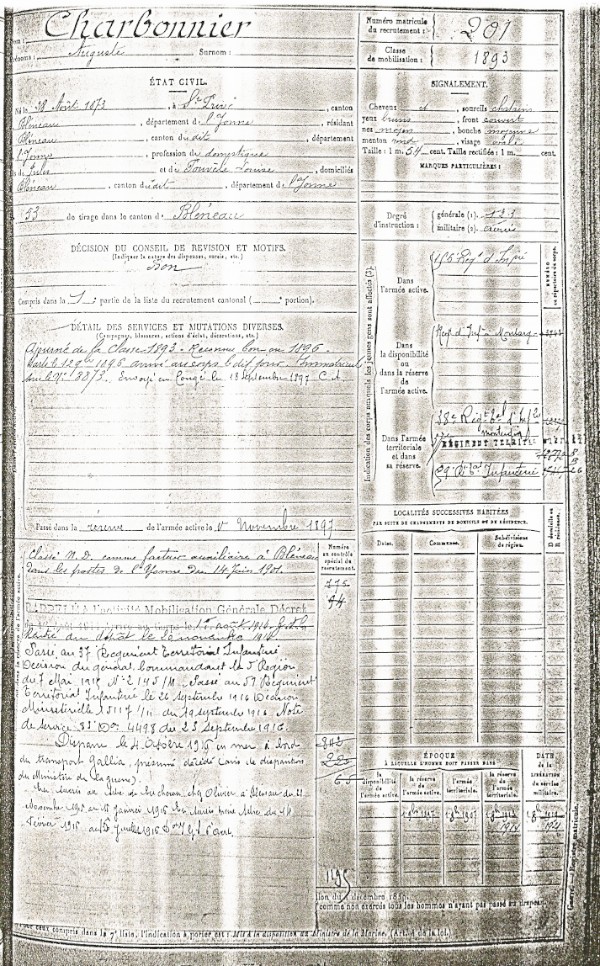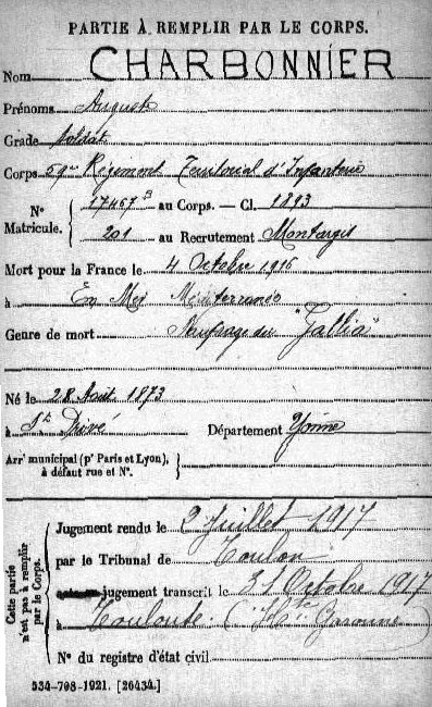 Disparu en mer lors du torpillage du Gallia. Enfants : Marie, 14 ans Marcel, 9 ans.Le lieu d`inscription au registre de l`Etat Civil parait bizarre…
