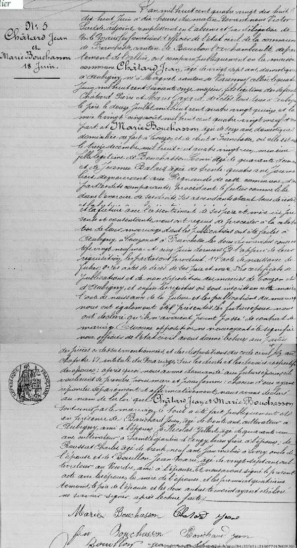 Marié à Franchesse (03) le 18/06/1898