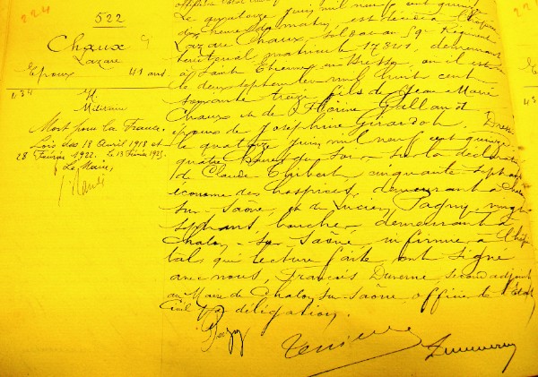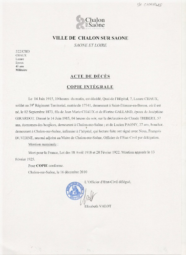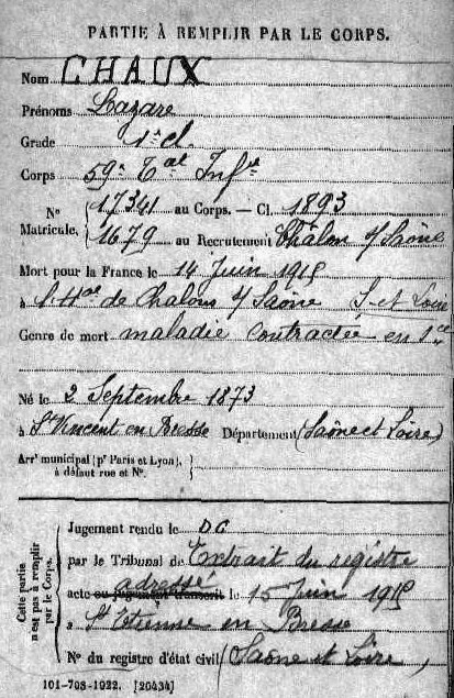 Le nom de Lazare CHAUX figure sur les MAM de St. Étienne-en-Bresse et St. Vincent-en-Bresse.