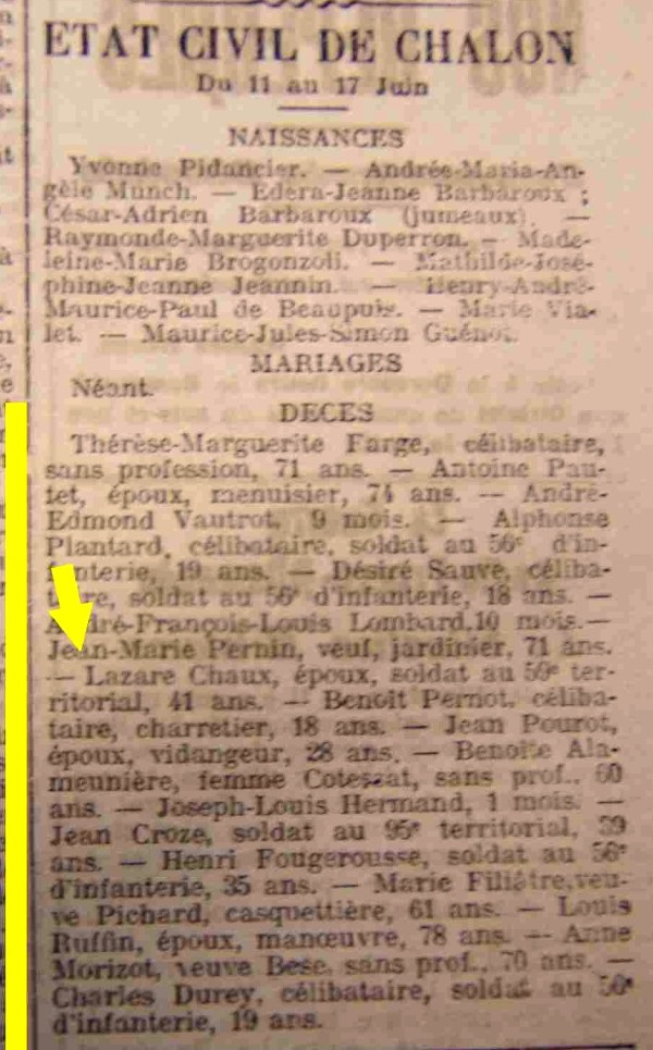 Marié à Saint-Étienne-en-Bresse (71) le 30/11/1905 où il figure également sur le monument aux Morts Avis DC = Courrier de S&L du 19-06-1915.