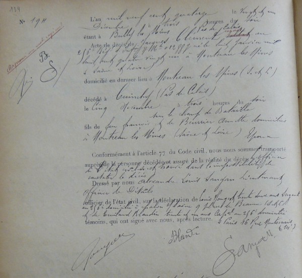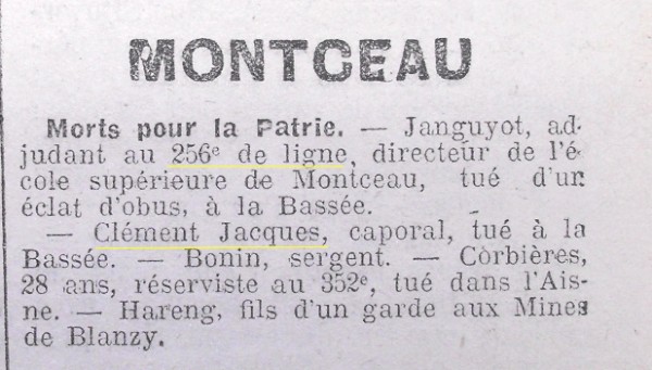 Lieu précis de décès : Combat de La Bassée